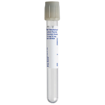 The 6mL BD Vacutainer® Fluoride Tube with BD Hemogard™ Gray Closure is designed for high-accuracy glucose and lactate testing. With 15 mg of sodium fluoride to inhibit glycolysis and 12 mg of potassium oxalate to prevent clotting, it ensures optimal plasma preservation for reliable biochemical analysis. The Hemogard™ closure enhances safety by minimizing blood exposure during handling.